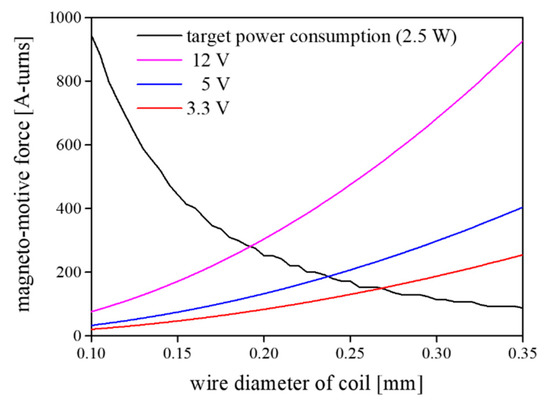 The solenoid coil was optimized to increase the resistive force related to the magneto-motive force (Fm) of the solenoid coil. The magneto-motive force (Equation (1)) is proportional to the number of turns (N) of the solenoid coil, input voltage (V), and area (P) of the coil. Furthermore, it is inversely proportional to the resistivity of copper (ρ = 1.72 × 10−8 Ωm) and the total length (ltotal) of the solenoid coil. Figure 6 shows the simulation results of the magneto-motive force as a function of the wire diameter. In Figure 6, the black line denotes the computed magneto-motive force under fixed power consumption (2.5 W), and the other three colored lines represent the magneto-motive force under fixed input voltages (12 V, 5 V, and 3.3 V). In this work, we chose the wire diameter of the solenoid coil to be 0.24 mm because we considered an input voltage of 5 V: