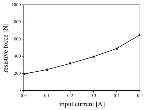 As mentioned before, two operation modes (flow and shear modes) simultaneously contribute to the actuation of the proposed module. The resistive force obtained from the flow mode of the MR fluids is expressed by Equation (2), and the resistive force by the shear mode is described by Equation (3). In Equations (2), and (3), the yield stress (σ), which is proportional to the magnetic intensity (H), was computed by using [18,19,20,21]. Based on these equations, we simulated the resistive force as a function of the input current. The computed resistive force increases from 193 N to 652 N as we increase the input current, as shown in Figure 7,