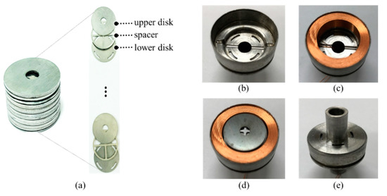 Fabrication process of the movable piston: (a) The layered disk where three patterns are repeated; (b) Shell; (c) Solenoid coil fitted in the shell; (d) Layered disk inserted into the shell; (e) Fabricated movable piston.