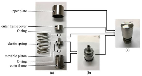 Figure 2a shows a three-dimensional illustration of the proposed MR actuator, composed of an upper plate, an outer frame cover, an elastic spring, a movable piston, MR fluids, and an outer frame. The combination of the outer frame, outer frame cover, and upper plate serves as a magnetic circuit, resulting in a closed-loop magnetic path. A solenoid was embedded into the movable piston. The magnetic flux resulting from the solenoid flows well through the three parts (the outer frame, outer frame cover, and upper plate), minimizing loss. Further, the movable piston was inserted into the outer frame, and MR fluids were poured into the outer frame. We, then, placed the outer frame cover on the outer frame and connected the elastic spring to the outer frame. By connecting the upper plate to the outer frame cover, we completed the fabrication of the proposed MR actuator. If a gap between the movable piston and the outer frame is large, MR fluid does not flow in the flow mode area and remains stationary, and the fluid leaks from the outer frame. To remove the gap, we used O-rings.
