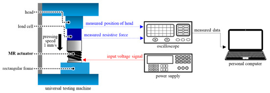 Figure 11 shows an experimental system that consists of a personal computer (PC), a power supply, and a universal testing machine (UTM, H5KT, Titus, Olsen), including a load cell. The proposed haptic actuator was attached on the upper surface of the rigid rectangular frame, which was bolted to the UTM. The measurement head was moved along the vertical (z-axis) direction (with a constant speed of 1 mm/s) to push down the proposed haptic actuator. The speed of the measurement head and the resistive force obtained from the load cell were conveyed to the PC. During this experiment, the resistive force was measured by changing the input current (from 0 A to 0.5 A) and measurement head position (from 0 mm to 4 mm).