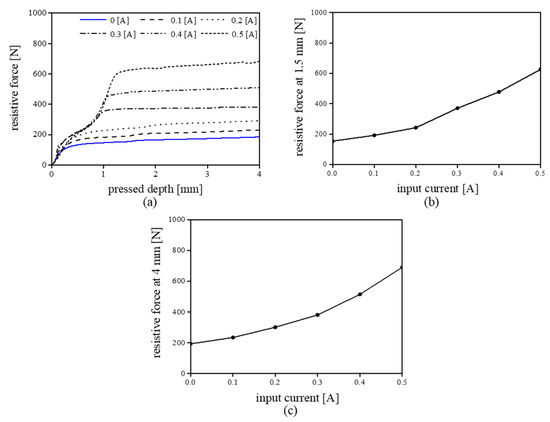 Figure 12a shows the measured resistive force as a function of the proposed actuator’s stroke (head position). As previously mentioned, we changed the input current from 0 A to 0.5 A at 0.1 A interval. Under no current, the resistive force of the proposed MR actuator was 154 N at a 1.5 mm stroke. The resistive force increased to approximately 625 N at 1.5 mm stroke when we provided an input current of 0.5 A. Therefore, the resistive force of the proposed MR actuator can be controlled by changing the input current. For all input currents, the resistive force increases until the stroke reaches approximately 1 mm, and then it becomes saturated. As previously mentioned, just noticeable difference (JND) of the human foot is approximately 30–50% [22]. If JND is assumed to be 40%, the user can sense over five steps of the magnitude of the haptic force.
