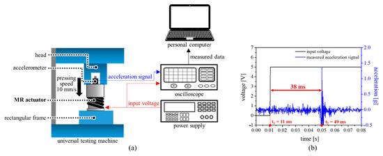 We used the same UTM as the previous one, and put an accelerator instead of the load cell (Figure 13a). The measurement head was moved along the vertical axis to push down the proposed actuator without applying current. During pushing, the applied input voltage at a moment makes the MR fluids rigid. At this time, MR fluid changes its state from liquid to solid, resulting in vibration. Figure 13b shows the measured response time of the proposed MR haptic actuator when we provide step input voltage to the proposed MR actuator. In Figure 13b, the solid black line is the applied input voltage and the solid blue line is the measured vibration when the step input is applied to the proposed MR actuator. The response time (38 ms) was computed by subtracting t1 (at the voltage is applied) from t2 (at vibration occurs). From the results, the proposed MR actuator can be useful for haptically simulating ground shape/compliance in virtual environment.