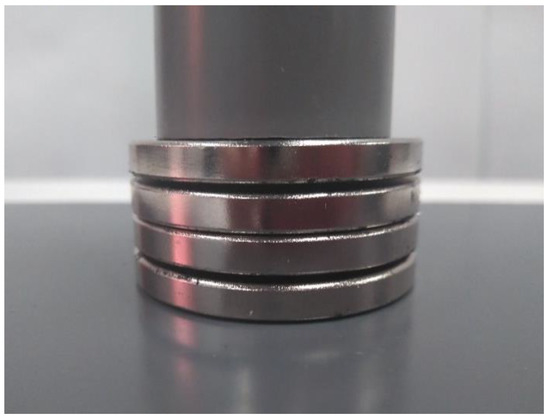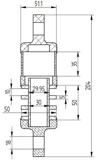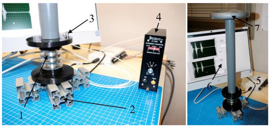 Figure 10 shows a photograph of the different parts in the assembled configuration. Accurate tolerance adjustments between the magnets’ inner radius and inner cylinder were done in order to provide smooth displacement, reducing friction while avoiding wedge blockings. A clearance of just 0.05 mm between the magnet’s inner radius and rod outer radius is achieved. Adapted top and bottom ends were 3D printed including threaded holes to attach the accelerometer and the suspended mass.