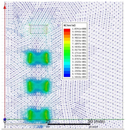 Figure 3. The magnetic field generated has minimum values in the middle of the separation distance of the magnets because magnets are oriented in opposite poles configuration. The repulsion of the magnets by pairs is what generates the stiffness of the system. When there is no load, magnets tend to be in the largest separation distance, limited by bulks limits of the mechanical structure.