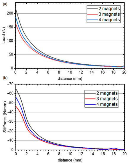 Figure 5 presents the relationship between repulsion force and separation distance of magnets faces for the three configurations: 2, 3, and 4 magnets. It is not possible to just simulate a pair of magnets and extrapolate since linear superposition principle, widely used in mechanics, is not applicable to magnetic fields. The results for the stiffness are also shown in