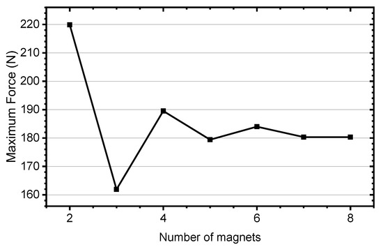 Figure 6. The maximum force oscillates for 2 to 6 magnets and then, it gets constant around 180 N for a larger number of magnets. While the number of magnets is reduced (2, 3 and 4), there is a direct influence between the top and bottom magnets among themselves. However, when the number of magnets increases, the influence between the top and bottom magnets is reduced, affecting only the more adjacent ones.