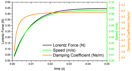 Figure 7 presents the Lorentz force and linear speed for a specific case as an example. With the asymptotic value of the force, we can determine the damping coefficient. By simulating Lorentz force at different speeds, we have found that for all of them, the damping force-speed ratio is constant with a total value of 5.15 Ns/m. This value applies for the two magnets case. For three magnets configuration, the damping coefficient is 10.30 Ns/m and for the four magnets configuration, the damping coefficient is 15.45 Ns/m. Thus, it is expected that the prototype with four magnets will dissipate faster than the prototype with two or three magnets since a larger amount of eddy currents are generated in total.