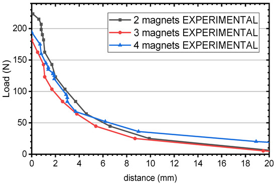 It is significant that the stiffness of the magnetic spring is not linear, but it progressively increases with decrease of distance between the magnets. This can be explained since magnetic force interaction of two dipoles depend inversely on the distance to the fourth power. It should be noted that stiffness and maximum load is quite similar for all three cases. Intermediate magnets, as they all have the same quality, just provide a continuity of the force interaction between the top and bottom magnets.