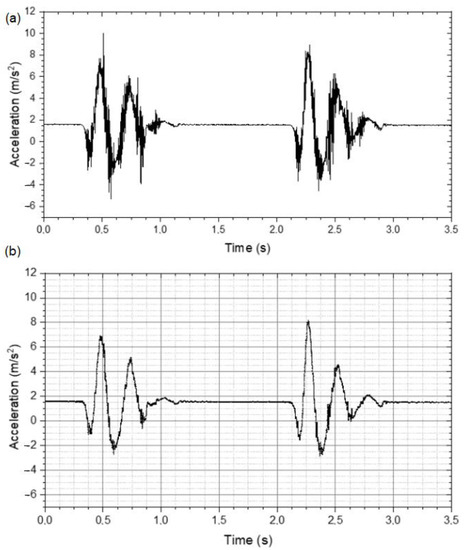 The accelerometer used was an IEPE uniaxial 3035B model from DYTRAN with a sensitivity of 100 mV/g, frequency response of 0.5 to 10,000 Hz, and 2.5 g of mass. Current source was also from DYTRAN, model E4114B1, with an adjustable output current between 2 and 20 mA. Measurements were taken using a DAQ system USB-6211 from National Instruments and registered by means of a personal computer and Labview software. Measurement of the voltage provided by the accelerometers were done using a fixed number of 10,000 samples at a sampling frequency rate of 1 kHz, i.e., 10 s of continuous registering,