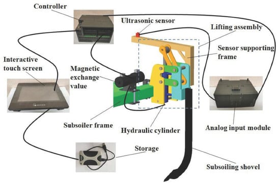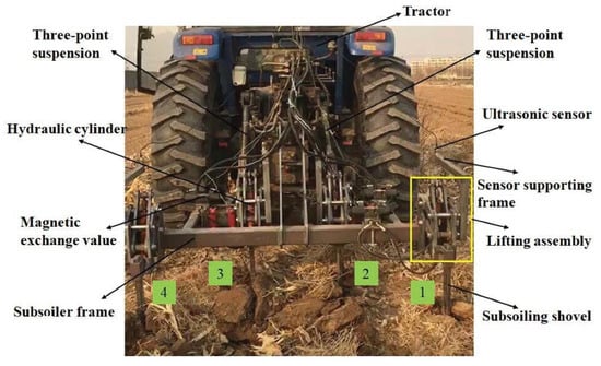 The tillage depth is a significant index affecting the subsoiling quality and energy efficiency [], while it is also an important consideration basis for the government to conduct subsoiling subsidies in China. During subsoiling operation, the soil-compacted hardpan cannot be broken completely with insufficient depth, and thus the poor quality of the soil properties’ improvement is obtained. Meanwhile, power consumption and operation cost are increased with excessive depth, resulting in the reduction of energy efficiency. Currently, the tillage depth is mainly measured manually at selected points in the subsoiled row in China. This method is incapable of obtaining the data of continuous tillage depth changing with time and it has high labor intensity and low work efficiency; especially the measurement accuracy of it is greatly affected by human factors, so it has large measurement errors []. Meanwhile, the adjustment of the subsoiling depth mainly depends on the working experience of the driver, so it is impossible to accurately and timely adjust the depth to the required tillage depth. Therefore, it is of prime importance to develop the on-line tillage depth detection and control method to obtain desired tillage depth of subsoiling machines.