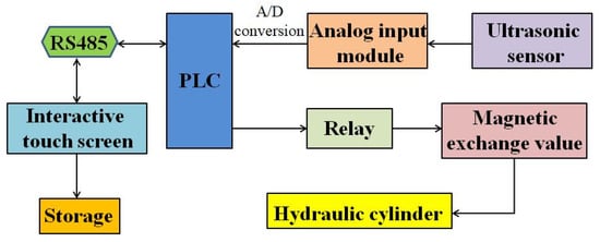 The block diagram of the tillage depth monitoring and control system is shown in Figure 2. The analog signal output by an ultrasonic sensor was converted into digital value by the analog input module. Then, it was analyzed, processed, and output by the PLC to control the driving circuit of the left or right switch belonging to the magnetic exchange valve to complete the corresponding operation. Meanwhile, the tillage depth was displayed in a timely manner on the interface of the interactive touch screen, which communicated with the PLC via the RS485 serial port, and the tillage depth was recorded in a timely manner in the storage.