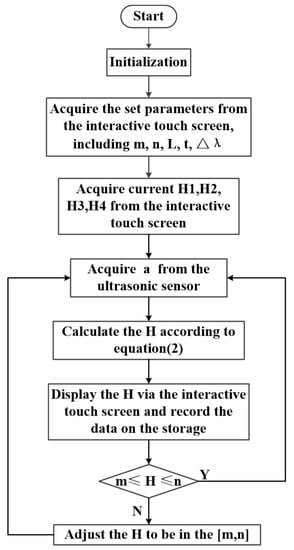 The flow chart of the main program is shown in Figure 3. After the tillage depth monitoring and control system was powered on, the values of set parameters could be entered on the interactive touch screen, including the minimum set value of tillage depth (m), the maximum set value of tillage depth (n), the vertical height between the signal transmitting end (receiving end) of the ultrasonic sensor and the bottom of the shovel tip (L), the system error (Δλ), and the delay time (t), which were all displayed on the interface of the interactive touch screen. Meanwhile, the current tillage depth of each subsoiling shovel, obtained by the sensor detection and controller process, was also displayed on the interface of the interactive touch screen. During the subsoiling operation, the ultrasonic sensor was used to detect the vertical height between the signal transmitting end (receiving end) and the field surface, which was represented by a. The analog quantity output by the ultrasonic sensor was converted into the physical quantity representing the distance by two conversions. Then, it was analyzed and processed by the controller according to the program written by the established mathematical model of tillage depth; thus, the current tillage depth of each subsoiling shovel, represented by H, was obtained and displayed on the interface of the interactive touch screen. If the current tillage depth was less than the minimum set value, the drive circuit of the left value belonging to the magnetic exchange valve would be controlled to be connected, and, thus, the hydraulic oil circuit corresponding to the left value would be opened to make the hydraulic cylinder shortened, so as to adjust the tillage depth increasing to be within the set range. If the current tillage depth was more than the maximum set value, the drive circuit of the right value belonging to the magnetic exchange valve would be controlled to be connected, and, thus, the hydraulic oil circuit corresponding to the right value would be opened to make the hydraulic cylinder lengthened, so as to adjust the tillage depth decreasing to be within the set range. If the current tillage depth was within the set range, the magnetic exchange value would automatically remain in the neutral position, and, thus, the subsoiling shovel would not be adjusted. The tillage depth of each subsoiling shovel was detected, displayed, recorded, and adjusted by the tillage depth monitoring and control system at a period of 1 s.