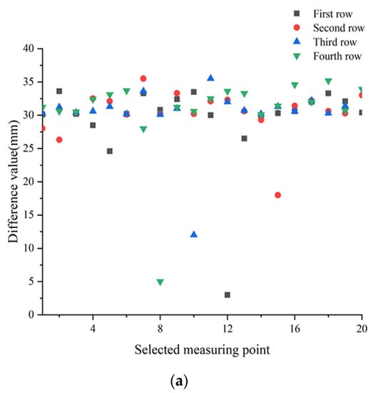 According to the soil conditions and tillage depths obtained by sensors and measured manually of 20 points in each row at three speeds, the data of two points were eliminated to get the difference value between the tillage depths obtained by these two methods at each remaining point (Figure 6), as well as the mean value of the tillage depths obtained by sensors and measured manually in each row at three speeds (Table 1). These two points included the fifth measurement point in the third row at the speed of 3 km/h, and the 14th measurement point in the first row at the speed of 5 km/h. The source of this was that the detection position of the ultrasonic sensor was in front of the subsoiling shovel. The tillage depth obtained by ultrasonic sensors at these two points was outside the set range, and, fortunately, they were adjusted in time by the control system. Therefore, the manual measurement values of these two points were all within the set range. Thus, the corresponding tillage depth data of these two points were eliminated.