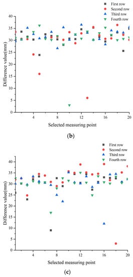 Difference value between tillage depths obtained by sensors and measured manually at forward speeds of (a) 3.0 km/h, (b) 4.0 km/h, and (c) 5.0 km/h.