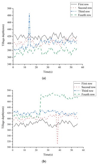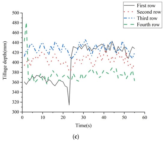 It was proven in Section 3.1 that the method of obtaining the tillage depth by ultrasonic sensors was reliable. The subsoiler with subsoiling assemblies advanced for 55 s under the operation of the monitoring and control system at the forward speeds of 3 km/h, 4 km/h, and 5 km/h, respectively. The tillage depth was recorded on the storage in the cycle of 1 s. Therefore, a total of 660 values of tillage depth detected by four ultrasonic sensors were recorded on the storage. Figure 7 shows changes of the tillage depth of each row at the forward speeds of 3 km/h, 4 km/h, and 5 km/h, with the x-axis representing the forward time of the subsoiler and the y-axis representing the tillage depth, which indicated that the surface of the experiment field had relative height differences along the transverse direction and forward direction of the subsoiler. According to the tillage depth obtained by sensors at the starting point of every subsoiling shovel, the difference of tillage depth between two adjacent subsoiling shovels was 10~35 mm. The tillage depth adjusted on the three-point suspension by the driver showed a trend of decrease (Figure 7a), increase (Figure 7c), and increase first and then decrease(Figure 7b) from the first subsoiling shovel to the fourth subsoiling shovel. The maximum differences of tillage depth between any two subsoiling shovels corresponding to the above trends were 65 mm, 82.5 mm, and 51.4 mm, respectively. The first two values were the difference of tillage depth between the first subsoiling shovel and the fourth subsoiling shovel, while the third value was the difference of tillage depth between the first subsoiling shovel and the third subsoiling shovel. Although the tillage depth of each subsoiling shovel obtained was within the set range at that moment, there were great differences of tillage depth between some subsoiling shovels. If all subsoiling shovels were adjusted simultaneously via the three-point suspension, some shovels obtained more undesired tillage depth, which made soil properties of each subsoiled row different and led to lower yields. Mu et al. [] found that a difference of 15 cm in tillage depth would result in a 6% reduction in wheat yield. Therefore, tillage depth of each subsoiling shovel needs to be measured and adjusted independently to obtain their respective desired values.