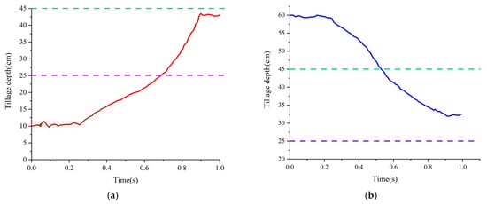 (a,b) respectively represent changes of tillage depth with time controlled by the system when the tillage depth was less than the minimum set value and more than the maximum set value within 1 s.