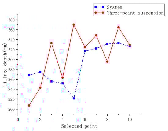 Changes in tillage depth of 10 points respectively selected along the second row of these two operations are shown in Figure 9; the tillage depth represented by the blue dot was obtained under the running state of the monitoring and control system, while the tillage depth represented by the red dot was obtained by only adjusting on the three-point suspension without running system. The mean value and standard deviation of tillage depth at 10 points in blue, respectively, were 290.27 and 38.31, and the mean value and standard deviation of tillage depth at 10 points in red, respectively, were 308.01 and 51.52. It was obvious that the discreteness of the tillage depth data belonging to the latter was greater than that of the former, so the tillage depth data obtained by applying the monitoring and control system developed in this study were more concentrated.