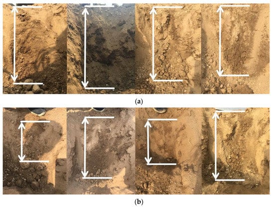 Subsoiling tillage is capable of loosening soil and breaking the compacted hardpan without turning or mixing soil layers, which are able to reduce bulk density and hardness and increase porosity and permeability [,,,]. Thanks to these obtained effects, this technology is beneficial for soil-structure improvement, water storage and conservation, and root elongation into deeper soil []. Desired bulk density can be obtained by subsoiling, and the bulk density shows a downward trend with the increase of subsoiling depth []. Benefiting from the increase of soil porosity after subsoiling, the capacity of water storage of soil is enhanced, which reduces the amount of irrigation every day [,]. Compared with the conventional tillage, the roots are longer and heavier in deeper soil with better permeability in both horizontal and vertical directions after subsoiling, which significantly increases the average density of root length by 13% []. Moreover, the physiological activity of roots is improved by subsoiling, which is mainly manifested in reducing the peroxidation degree of cell membranes and delaying the senescence of roots, and thus contributing to higher crop yields [].