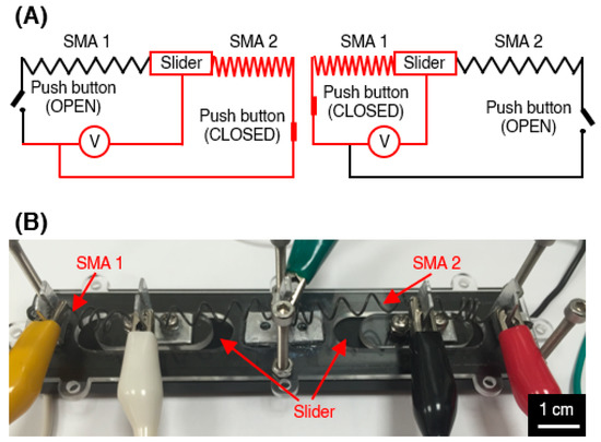 In our prototype, the activation of the SMA spring by heating to a temperature above its transition temperature was achieved by Joule heating by connecting the SMA spring to an electrical power source, as illustrated in Figure 2A. A simple 9 V battery was found to be sufficient to return the deformed SMA to its original shape. The illustration of the simple electronic circuit that can generate Joule heating to a different portion of the spring is shown in Figure 2A,B. In the illustration, the red portion of the spring indicates that the current is passing through that area and therefore, that portion of the spring is subjected to Joule heating.