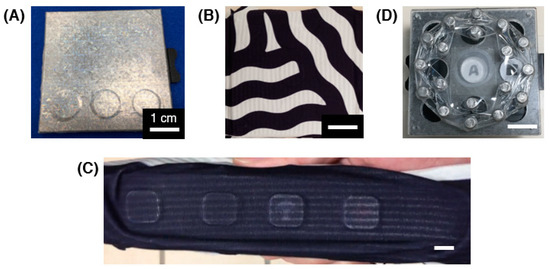 (A) Modified holographic film (button set A; top surface: 10 cm × 10 cm); (B) (button set A; top surface: 10 cm × 10 cm); and (C) sublimation printed elastic cloth (button set B; top surface: ≈ 20 cm × 3 cm); (D) elastomer-based transparency film (button set A; top surface: 10 cm × 10 cm).
