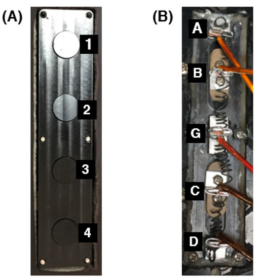 Figure 10A,B show the top and bottom appearances of the buttons on demand device prototype after it was slotted into the plastic case with the electrical wires connected at various points along the spring. In Figure 10A, the buttons are marked from top to bottom as 1, 2, 3, and 4, whereas in Figure 10B, the wires are denoted with the letters A, B, G, C, and D. There are two sliders in the above prototype: one controlling buttons 1 and 2, and the other controlling buttons 3 and 4. The two sliders and therefore, the button pairs 1–2 and 3–4, can be independently controlled by connecting the wires into separate power sources.
