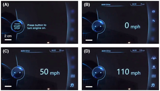 The user interface simulation was programmed to simulate a driving scenario whereby the driver can choose interchangeably between parking mode at 0 mph, city driving mode at 50 mph, and highway driving mode at 110 mph, by means of swiping left and right at the screen of the tablet. In addition, different functions and features corresponding to different buttons’ activation have also been programmed in the simulation depending on which mode the simulation was currently in. Figure 12A–D show the snapshots of the user interface simulation in the engine’s off state, parking mode, city driving mode, and highway driving mode, while Figure 13A,B shows the appearance of the buttons on demand device set when only two buttons and all four buttons are active.