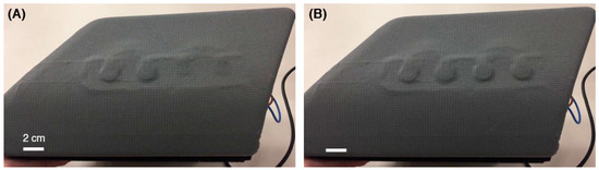 In general, all the materials tested in our work showed promising abilities in enhancing the visual appearance of the active buttons. The most promising result was provided by the sublimation printed elastic cloth. This particular cloth was relatively thin, highly stretchable, and easy to handle. Figure 15 shows the appearance of the cloth covered button set when the buttons are inactive (Figure 15A) and when the buttons are active (Figure 15B). From Figure 15A, it can be observed that when the buttons are inactive, the cloth will fully conform to the flat surface of the buttons. On the other hand, when the buttons are active (Figure 15B), due to the 1.5 mm rise of the buttons, the portion of the cloth that is directly on top of the buttons will be stretched and therefore, become lighter in color—especially along the border of the buttons. This is because the elastic cloth adheres to the top cover of the button set, but it does not adhere to the buttons. In our test, this particular cloth performs better than other elastic cloths because once the protrusions of the buttons are removed when the buttons return to inactive state, the cloth instantaneously returns to being flat, i.e., no residual stretching observed along the border of the buttons.