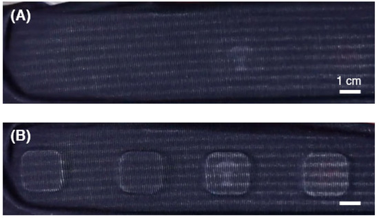 Several color change materials have been explored and tested in this work, such as the standard elastic cloth, pristine and modified holographic film (Figure 6A), sublimation printed elastic cloth (Figure 6B,C), and elastomer-based transparency film (Figure 6D). Apart from the elastomer-based transparency film, the remaining color change materials are commercially purchased from various sources.