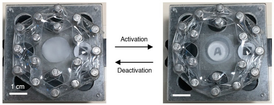 Various color change materials can be laid on top of the top surface of the device prototype to enhance the visual appearance and distinction of the active buttons from the inactive ones. These color change materials belong to a class of mechanochromic materials, which are materials that undergo color change when the mechanical load is applied on it [17,18]. The rise of the buttons when they are activated exerts a localized mechanical load on the color change materials and therefore, causing some or all parts of the material directly on top of the active buttons to change its color or form a distinguishing contour of the active buttons. Consequently, the active and inactive buttons can also be visually distinguished as they have different colors.