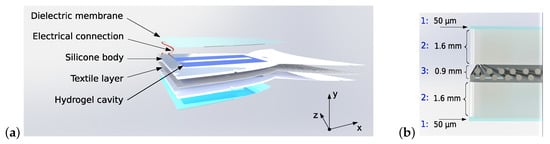 The casting of the inner structure was carried out using the silicone material Sylgard 184 (Dow Corning, Midland, USA). The used cast mold was manufactured according to the geometrical design of the robot with respect to Figure 1 and Figure 2. The DEAs on both outer sides of the robot consisted of a silicone-based material Elastosil 2030 (Wacker, München, Germany). The membranes are equi-biaxially pre-stretched to a ratio of 1.5, leading to a membrane thickness of 22.2 μm in the stretched state. Afterwards the dielectric membranes were attached to the inner structure using Sylgard 184. In that step, also the electrical wiring was placed and encapsulated under the dielectric membranes with the silicone glue. After the materials were crosslinked and cured, the hydrogel was injected into the cavities using multiple cannulas. Therefore, the pre-mixed hydrogel solution was injected after the polymerization to crosslink right in the desired position of the cavities. Afterwards, the cannulas were removed and the penetrations were sealed with silicone.