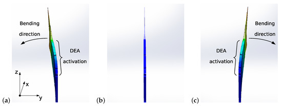 Tri-stable bending principle of the robotic concept: (a) bending to the left side by activating the DEA on the right side; (b) initial straight configuration without activation of any DEA; (c) bending to the right side by activating the DEA on the left side.
