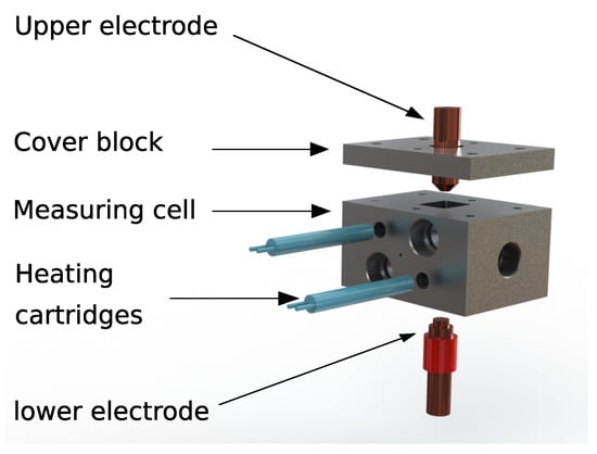 Concept of the measurement cell with heating cartridges and copper electrodes to contact the sample inside of an aluminium block.
