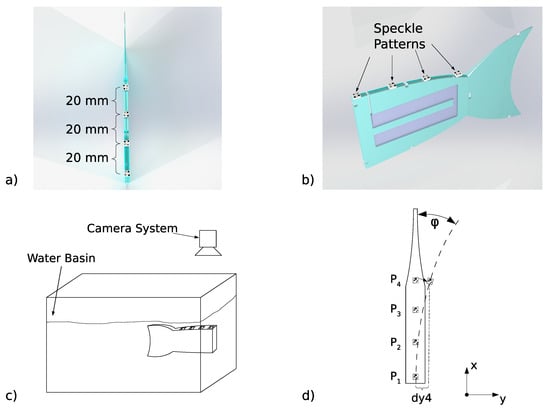 To evaluate the bending behavior and the deflections of the built robot under water, a camera-based digital image correlation (DIC) measurement was used. The used camera system is an ARAMIS 5M (GOM, Germany) camera with the corresponding software ARAMIS v. 6.2. The measurement was calibrated to deliver position data with a frame rate set to a maximum of 29 Hz. The images were recorded with an image area of 1224 × 1025 pixels at a distance of approximately 50 cm from the object to the camera lens. To enable the camera system to detect the position data, four speckle patterns were glued on top of the robot. The speckles were generated with the software Speckle Generator from Correlated Solutions, printed on paper and covered with a protective silicone layer. Afterwards, they were glued on top of the fish fin along the active area. Figure 5a,b illustrates the prepared robot with the speckle patterns. The first speckle pattern was located at the clamped front part and the three further ones were attached with a distance of 20 mm from each other’s center.