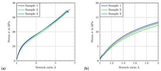 Stress–stretch curves for the tensile tests. (a) Results of the measurement until fracture (b) zoom-in of the stress–stretch curves in the relevant stretch range.