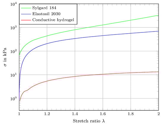 For measurement, the samples are taken out of the moisturizing storage box and measured in one run. Drying effects can occur over the measurement time, explaining the slight offset of the curves. The slight fluctuations in the curves for the measurement until fracture are due to the mechanical mounting in the tensile testing machine and do not reflect any particular features of the material tested. To put the detected elastic properties of the hydrogel in context to the other polymer materials, Figure 7 gives a comparative overview between the stress-stretch properties of the conductive hydrogel, the dielectric material and the matrix material. It can be easily obtained that the used hydrogel is softer by orders of magnitude. The used hydrogel electrodes are also fabricated in smaller dimensions than the matrix material and the structure itself. Therefore, the stretch–stress comparison between the polymer materials can be used to obtain an impression about the compliance influence of the hydrogel on the robotic structure. From this comparison it can be deduced that the mechanical behavior of the overall structure is barely influenced by the hydrogel.