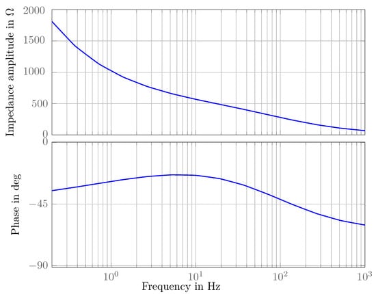 Figure 8 shows an illustrative example of the electrochemical characterization of the hydrogel by impedance spectroscopy. The measurement resulted in low-noise, clear and plausible impedance spectra: As shown in Figure 8, the impedance values of the hydrogel are detected in the lower kΩ range within the investigated frequencies. In comparison to established electrode materials based on carbon fillers, showing resistance values in the range of 101 kΩ for electrodes in the size of 5 mm × 30 mm, the detected values are in a comparable order of magnitude [23]. The stable measurement and the detected range of the impedance values indicates that a proper charge transport in the material is given and the hydrogel can be regarded as conductive in terms of the desired application. Conversely, the principle applicability of this measurement method is proven. The phase amounts to ca. −45° what means that a resistive–capacitive behavior is detected. Since the desired application is sufficiently examined by determining the absolute properties of impedance, the method is not supported with equivalent circuit models which is most commonly used to draw more detailed conclusions from the impedance spectrum.