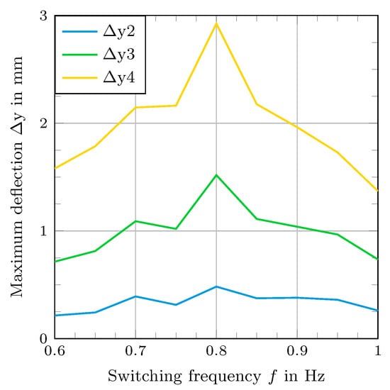To obtain an estimation of the resonance frequency of the system moving under water the detected deflections from the measurement series were processed. The maximum deflections were calculated from the DIC measurements of the movement of the fish fin in water (see Figure 5) for the different switching frequencies. By subtracting the minimum deflection from the maximum deflection of the whole measurement series: