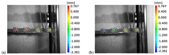 Recorded images of the DIC measurement together with the detected displacement information in y-direction. (a) Exemplary for the robot near its initial state (b) for a deflected state.