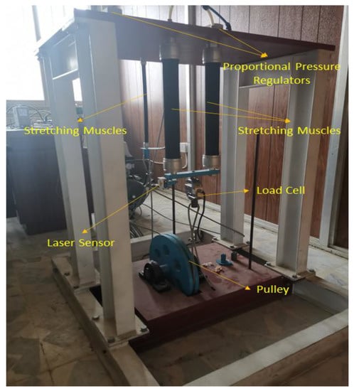 Measurement of the distance (contraction) in PAMs was done using a SOEL-RTD-Q50-PP-S-7L FESTO™ laser sensor. This sensor has a working range of 80–300 mm, and a resolution of 0.3 mm. Determining this operating range was based on the literature on PAMs, where it is known that PAMs can have a maximum contraction of up to 25% of their length []. The muscles used in this arrangement have a length of 305 mm and a maximum contraction of 76.25 mm, accordingly. Furthermore, a laser sensor was selected due to its ability to measure the contraction in a PAM without the need for direct contact, thus reducing the errors that could result from a direct contact between the PAMs and the measuring device.