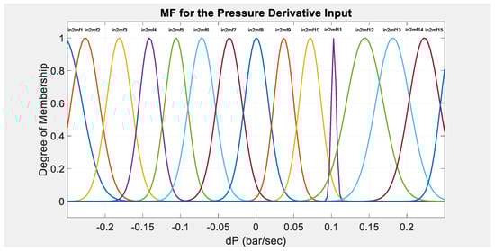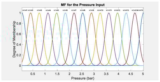 The second step was choosing the membership function (MF) type and the number of MFs for the designer to build the model around. Using trial and error, it was found that using a Gaussian-type MF and having 15 MFs per input yielded acceptable results without using excessive computational power; the MFs are shown in Figure 3 and Figure 4. It is agreed in the literature that the type of membership function is not crucial in shaping how a model performs. The only condition that a membership function must satisfy is that it must vary between 0 and 1. The trial and error method has been found to be useful for choosing an appropriate membership function. The membership functions are selected based on simplicity, convenience, speed, and efficiency []. Additionally, both the ANFIS architecture and the rule base surface are shown in Figure 5 and Figure 6. The ANFIS multilayer architecture should achieve an acceptable training error. The rule base surface helps in viewing the dependency of the output on any one or two of the inputs.