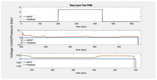 A step input signal was fed into the PAM in order to measure the time the system requires to achieve steady-state behavior. Figure 8 depicts how the system responds to a step input voltage of 5 volts. The third subplot of the figure shows that the muscle begins to achieve steady-state behavior after approximately 150 s. Despite the system fluctuating in pressure value at 400 s, that fluctuation is cyclic and is likely due to the nature of compressed air and the friction it may experience as it is entering the muscle.
