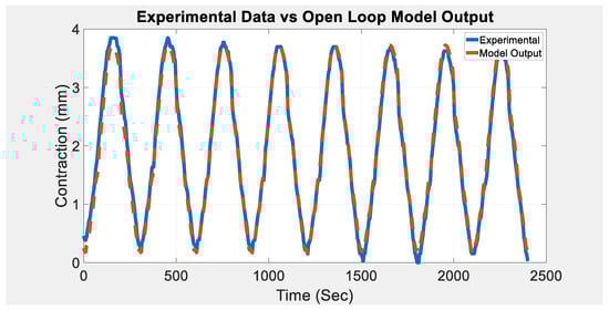 Examining the above figure clearly indicates that the output of the ANFIS model in an open-loop scenario matches that of the experimental data. Furthermore, the contraction of the PAM seems to mimic that of the sinusoidal voltage fed into.
