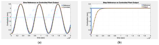 Investigating the above figure, it can be observed that the sinusoidal reference was achieved much faster than their step counterpart. This can be attributed to the fact that the ANFIS model itself was based on a sinusoidal signal due to its easy to differentiate nature. Furthermore, the results shown in Figure 8 are based on a reference frequency of 0.0001 rad/s, which is a much lower frequency than the experimental data which the ANFIS model was trained on. The PI controller had difficulty achieving acceptable tracking when the frequency was increased, which still requires further investigation.