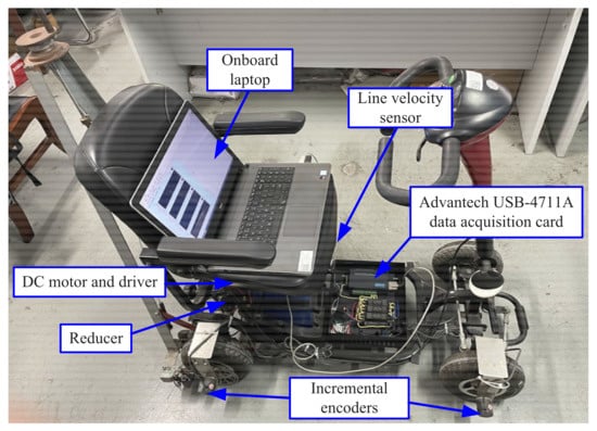 To further investigate the performance of the proposed prognosis method under the experimental environment, the fault scenario described in the Case II of Section 3.2 was considered, where (i.e., ) suffers from intermittent faults. The designed degradation process of intermittent fault features of in TW was expressed as . A diagram of the experimental platform workflow is given in Figure 8. The lead–acid batteries (model: 12 V 20 AH lead–acid batteries) supplied power to the DC motor driver. The control signal to the DC motor driver (model: CRRTIS 1212-2201, nominal voltage 24 V, drive current 45 Amps, peak boost current 55 Amps, maximum boost duration 10 s) was provided by the USB data acquisition card (model: Advantech USB-4711A, USB 2.0 interface, 16 analog input channels, 12 bit resolution, sampling rate 150 kS/s), powered by the onboard laptop. The velocities of the electric scooter were measured by three incremental encoders (model: Omron E6B2-CWZ3E, resolution ratio 1000P/R, rated voltage 24 V). The onboard laptop provided voltage to the data acquisition card and sent an input signal to the motor driver. The FDI procedure of the electric scooter system was accomplished by the LabVIEW module, while distributed fault estimation and ACS-ELM based prognosis were conducted by introducing MATLAB script node into LabVIEW, based on which the co-simulation between MATLAB and LabVIEW could be implemented. The proposed methods were implemented in MATLAB R2015a and LabVIEW 2014 using an onboard laptop with an Intel Core i7-6500 2.6 GHz CPU with 8 GB memory and Microsoft Windows 7 Enterprise SP1 64-bit operating system.