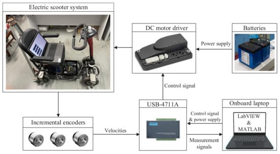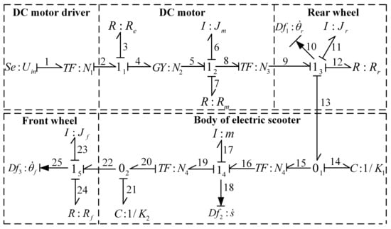 The structure diagram of the electric scooter is given in Figure 1, based on which its DBG model can be built, as shown in Figure 2. The DBG model of the electric scooter contains five parts, i.e., DC motor driver, DC motor, rear wheels, body, and front wheels. Descriptions of the main parameters of the model are summarized in Table 1. In the DBG model of the electric scooter system, the mechanical friction of the DC motor consists of a viscous friction coefficient and Coulomb friction torque . Similarly, the rear wheel friction contains a viscous friction coefficient and Coulomb friction torque . The front wheel friction also contains a viscous friction coefficient and Coulomb friction torque . Additionally, there are three flow sensors in the BG model: and are used to measure the angular velocities of rear wheels and front wheels, respectively, and is adopted to measure the line velocity of the electric scooter body.