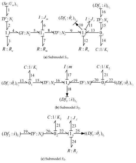 Theoretically, the number of submodels is determined by the number of sensors in the global model. Therefore, three submodels, as shown in Figure 3, are built from the global DBG model of the electric scooter system. Based on Figure 3, the submodel MARRs can be derived as follows.