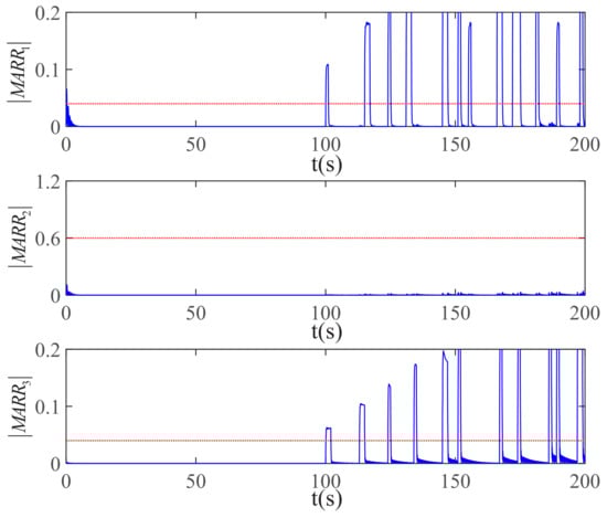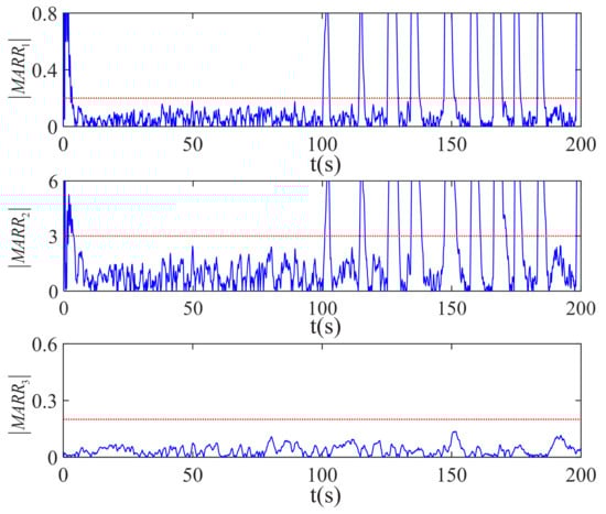 Firstly, the residual responses are shown in Figure 5, where dashed lines are thresholds and solid lines are residuals. The thresholds in the simulation process were chosen by observing the residual responses under normal simulation model conditions (i.e., 0.04 for , 0.6 for , and 0.04 for ). Only the residual responses of s are demonstrated in Figure 5 for easy observation, while the detection processes of the later 900s were similar to s, and were no longer on display. From Figure 6, it can be observed that and intermittently exceed their thresholds; accordingly, a CV can be determined as CV = [1 0 1], and the SPF was obtained by comparing CV with FSM, i.e., SPF = .