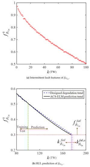 When the ACS-ELM prediction model is determined, taking as the initial input of the ACS-ELM prediction model, the one-step-ahead prediction procedure is implemented to predict the next intermittent fault feature until the predicted feature value exceeds the predefined threshold, i.e., . However, the RUL of the intermittently faulty component is predicted based on TW sampling, and the ACS-ELM-model-based prediction result refers to the th TW, in which the failure threshold is exceeded. Therefore, the end-of-life (EOL) and RUL of the intermittently faulty component can be calculated as: