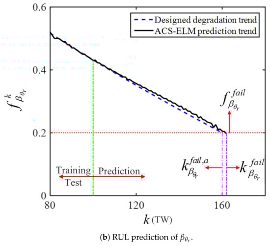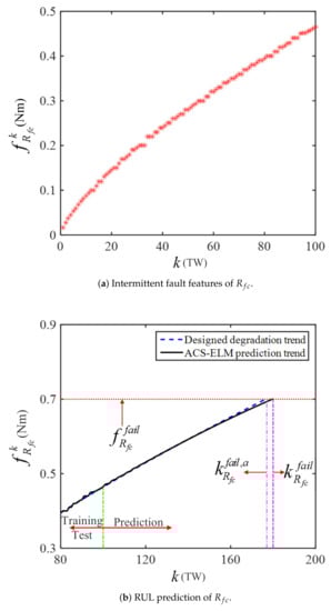 After that, the intermittent fault feature datasets of and , i.e., and , are depicted in Figure 6a and Figure 7a, respectively, where = and are both illustrated by 100 discrete points. With and , the ACS-ELM-based prognosis module introduced in Section 4.2 can be activated to predict the RULs of and . The ACS-ELM parameters are set as , , , , and . The failure thresholds of and are preset as and Nm. The prediction results of and using the ACS-ELM approach are illustrated in Figure 6b and Figure 7b. From Figure 6b, exceeds its failure threshold in the 175th TW, i.e., , thus the ranges of RUL of can be calculated as s based on (26). Similarly, it is clear that the prediction results of are and s from Figure 7b.